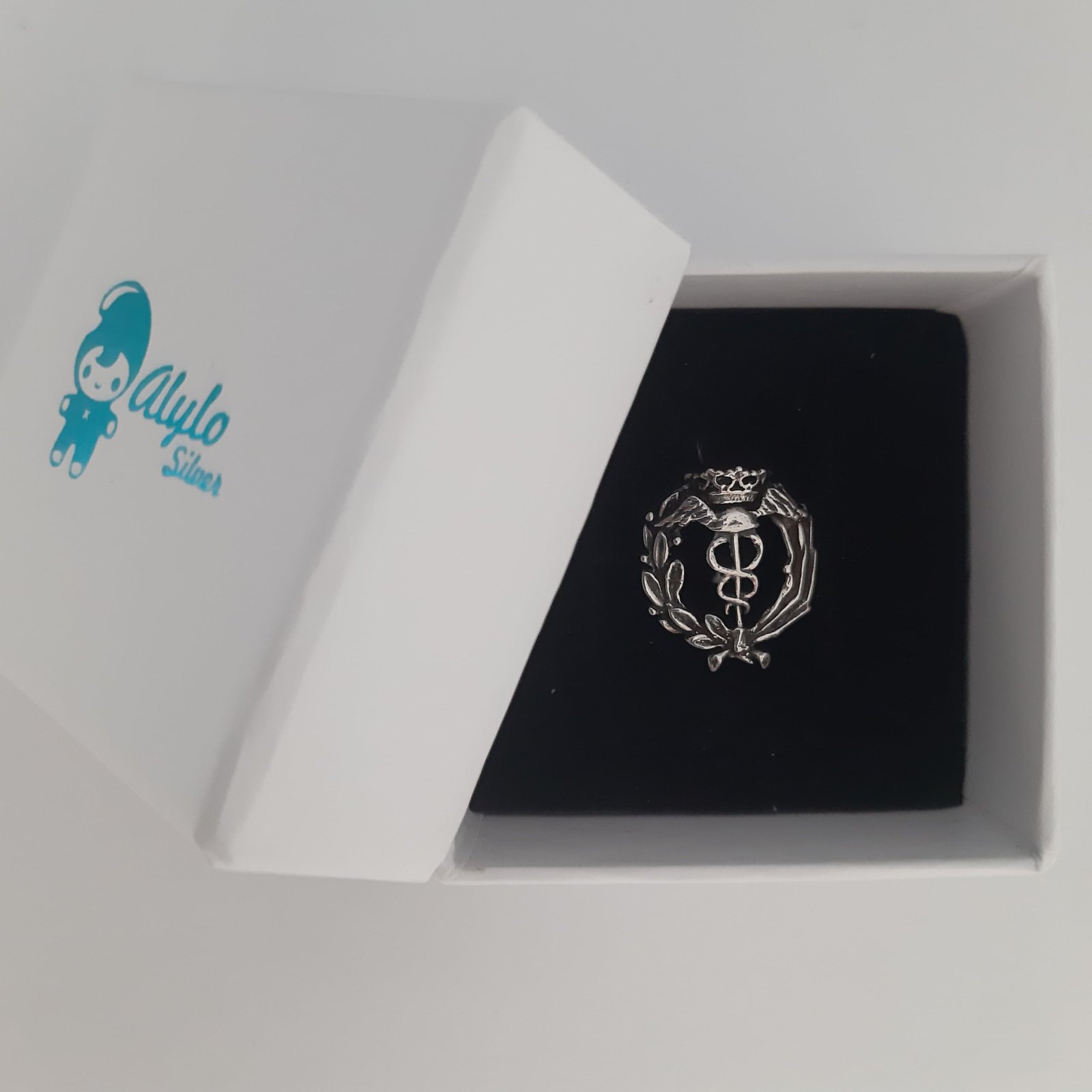 Insignia profesional Comercio fabricada en plata de ley 925. Diseño elegante y duradero, perfecta como regalo o distinción profesional. Incluye estuche de regalo.