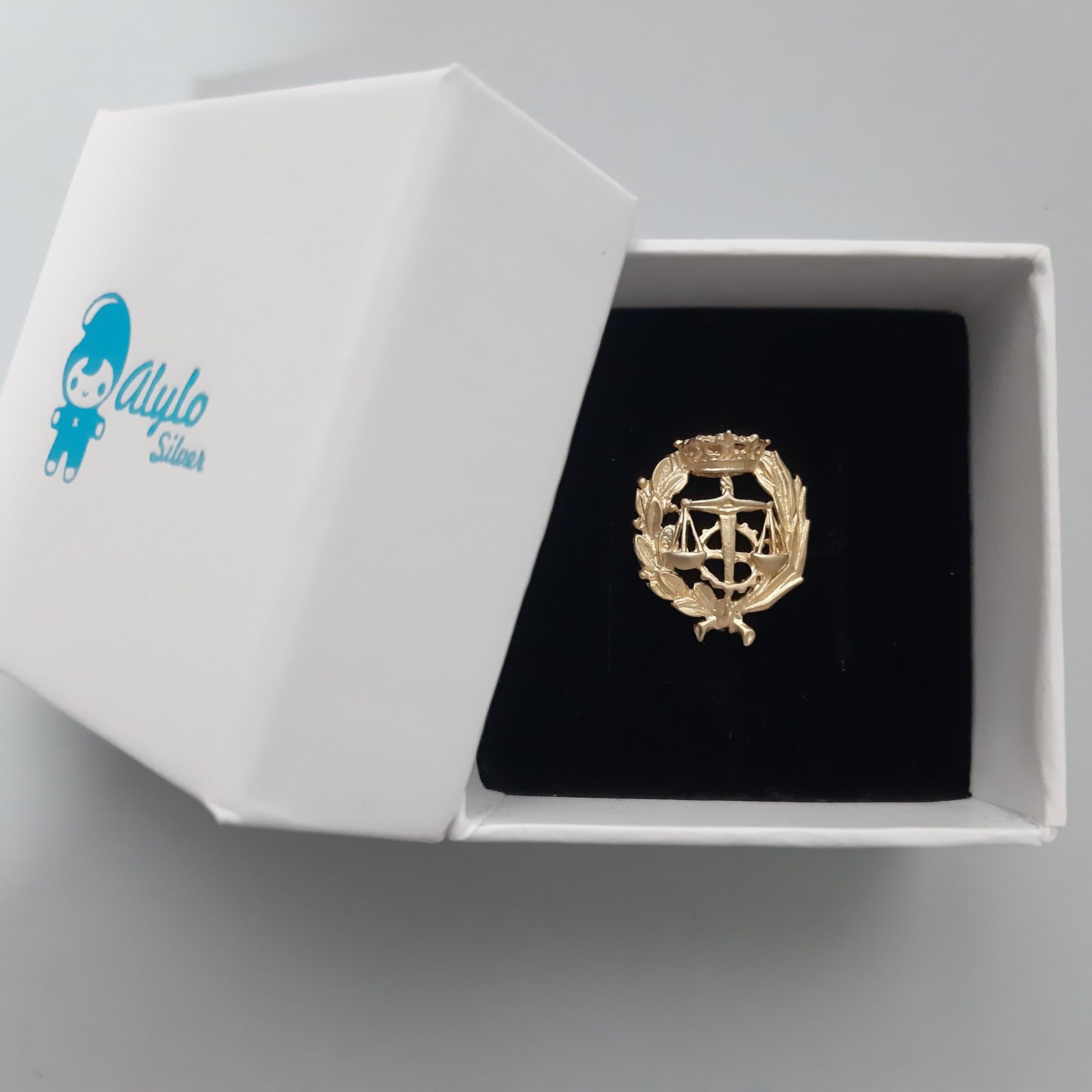 Insignia profesional Graduado Social fabricada en plata de ley 925 chapada en oro. Diseño elegante y duradero, perfecta como regalo o distinción profesional. Incluye estuche de regalo.