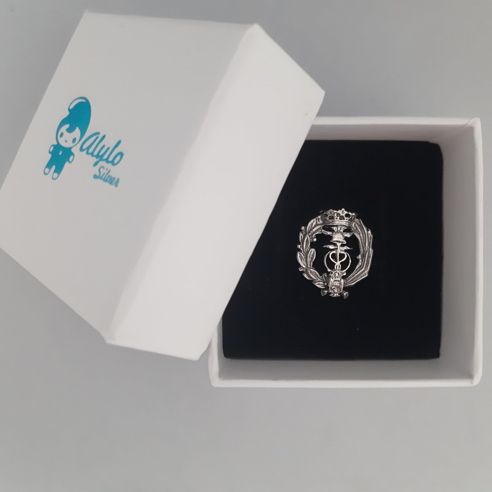 Insignia profesional Representante Comercial fabricada en plata de ley 925. Diseño elegante y duradero, perfecta como regalo o distinción profesional. Incluye estuche de regalo.